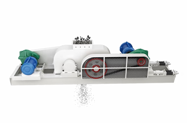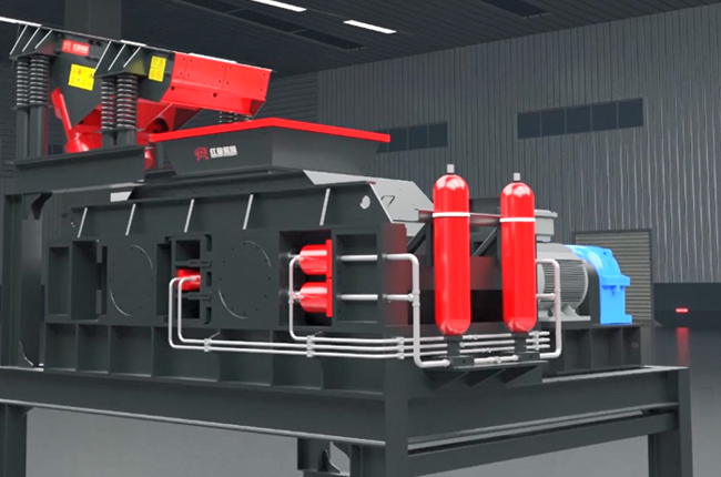 將破碎物料經給料口落入兩輥子之間,進行擠壓破碎,成品物料自然落下。遇有過硬或不可破碎物時,其輥子可憑液壓缸或彈簧的作用自動退讓,使輥子間隙增大,過硬或不可破碎物落下,從而保護機器不受損壞。相向轉動的兩輥子有一定的間隙,改變間隙,即可控制產品排料粒度。