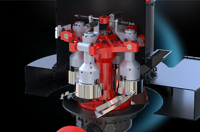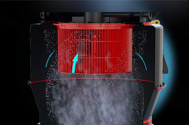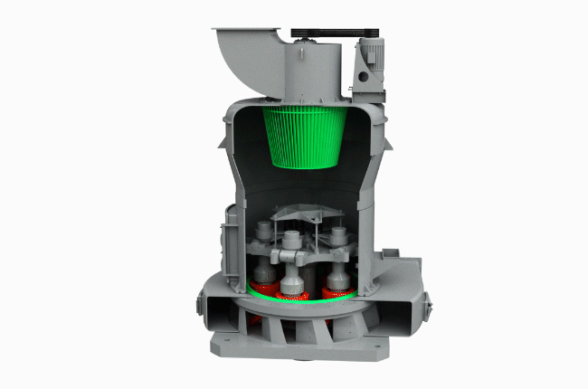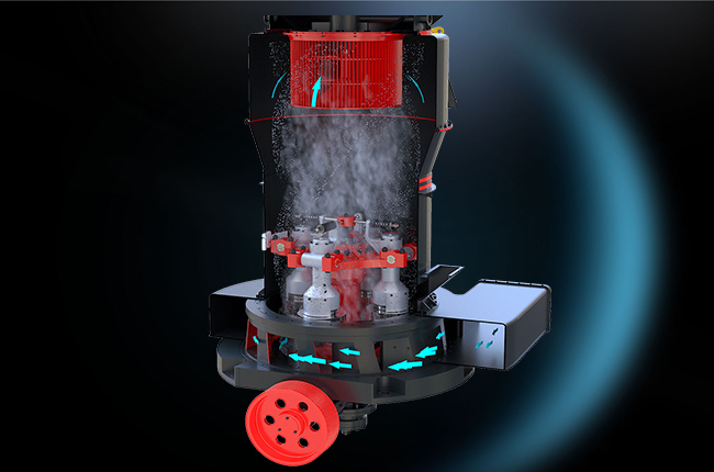 該機(jī)結(jié)構(gòu)主要由主機(jī)、分析器、風(fēng)機(jī)、成品旋風(fēng)分離器、微粉旋風(fēng)分離器及風(fēng)管組成。其中,主機(jī)由機(jī)架、進(jìn)風(fēng)蝸殼、鏟刀、磨輥、磨環(huán)、罩殼組成。雷蒙機(jī)工作時,將需要粉碎的物料從機(jī)罩殼側(cè)面的進(jìn)料斗加入機(jī)內(nèi),依靠懸掛在主機(jī)梅花架上的磨輥裝置,繞著垂直軸線公轉(zhuǎn),同時本身自轉(zhuǎn),由于旋轉(zhuǎn)時離心力的作用,磨輥向外擺動,緊壓于磨環(huán),使鏟刀鏟起物料送到磨輥與磨環(huán)之間,因磨輥的滾動碾壓而達(dá)到粉碎物料的目的。