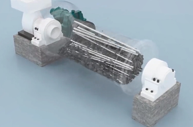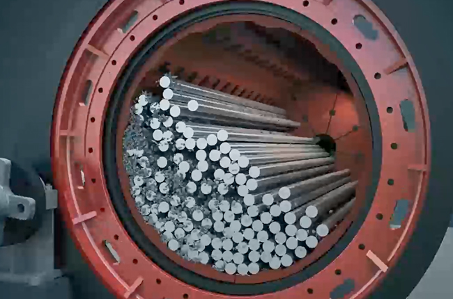 棒磨機由電機通過減速機及周邊大齒輪減速傳動或由低速同步電機直接通棒磨機過周邊大齒輪減速傳動,驅(qū)動筒體回轉(zhuǎn)。筒體內(nèi)裝有適當?shù)哪サV介質(zhì)-鋼棒。磨礦介質(zhì)在離心力和摩擦力的作用下,被提升到一定高度,呈拋落或斜落狀態(tài)落下。被磨制的物料由給礦口連續(xù)的進入筒體內(nèi)部,被運動的磨礦介質(zhì)所粉碎,并通過溢流和連續(xù)給礦的力量將產(chǎn)品排出機外,以進行下一段工序作業(yè)
