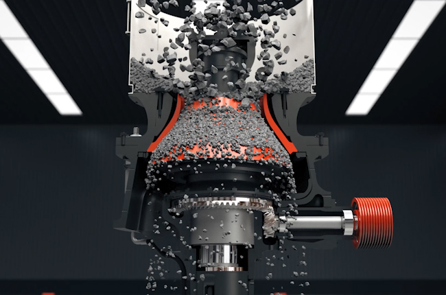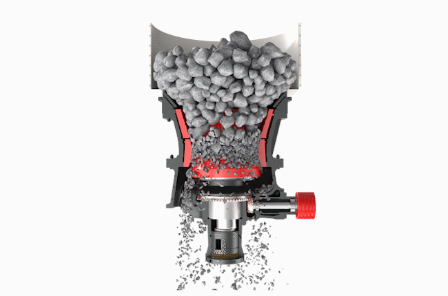 單缸圓錐破碎機工作時,電機帶動破碎機的小齒輪,小齒輪帶動大齒輪,大齒輪組件帶動偏心套組件和主軸組件以理論垂直線為中心,在銅襯套內(nèi)公轉(zhuǎn),主軸組件在偏心銅套內(nèi)以主軸的中心線可以實現(xiàn)自轉(zhuǎn)。當物料加入到破碎腔后,主軸總成在物料的阻力下在偏心銅套內(nèi)緩慢的自轉(zhuǎn)。內(nèi)錐的運行軌跡看起來是在破碎腔內(nèi)來回擺動,同時緩慢的旋轉(zhuǎn)。物料被擺動的內(nèi)錐擠壓破碎,破碎出的物料從而排料口排出。